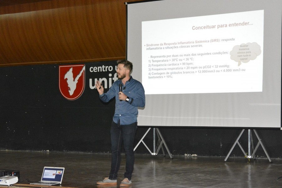O rol de palestrantes reúne mestres e doutores em várias especialidades, gabaritados por amplas produções científicas. Na foto, o médico veterinário e doutorando em Anestesiologia, Felipe Comassetto, fala sobre o Manejo Perioperatório das prioriedades na Sepse.