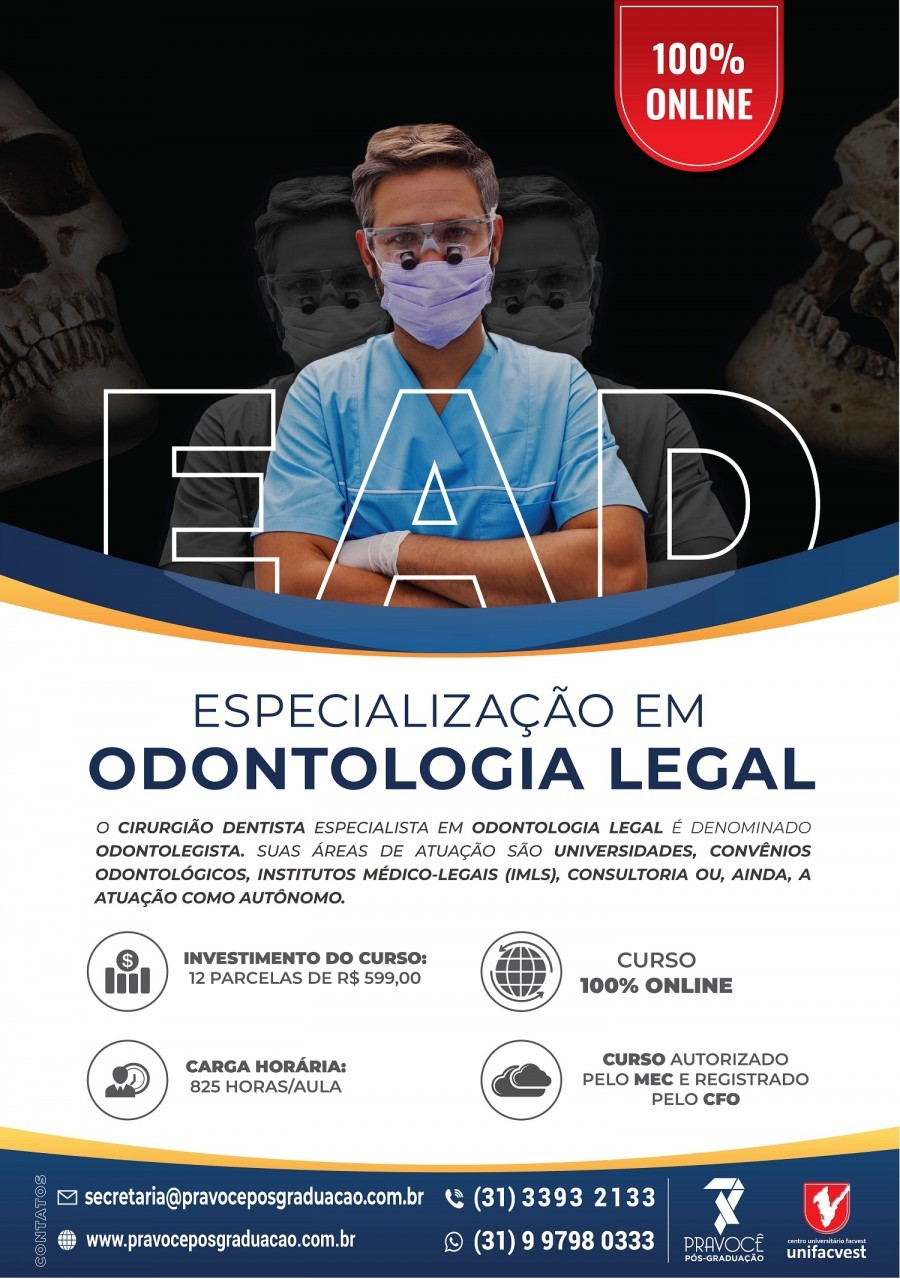 Unifacvest e Pra Você pós-graduação apresentam o Curso de Especialização em Odontologia Legal 100% on-line para todo o Brasil. Informações pelo whatsapp (31) 9 9798 0333 ou pelo e-mail secretaria@pravoceposgraduacao.com.br