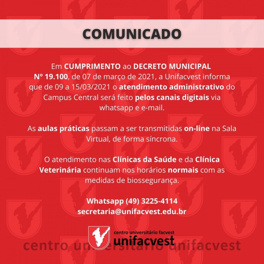 Em CUMPRIMENTO ao DECRETO MUNICIPAL Nº 19.100, de 07 de março de 2021, a Unifacvest informa que, de 09 a 15/03/2021 o atendimento administrativo do Campus Central será feito pelos canais digitais via whatsapp e e-mail.