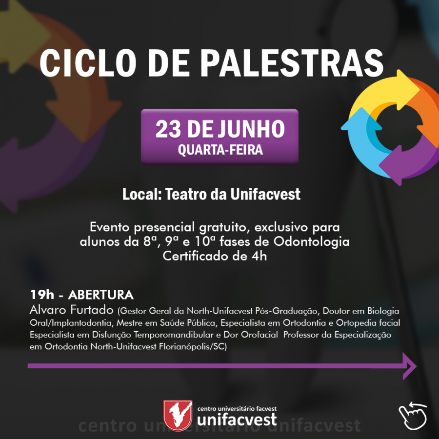 Atenção alunos das últimas fases da Odontologia (8ª, 9ªs e 10ªs). Na quarta-feira, dia 23/jun, todos estão convidados para o Ciclo de Palestras que acontece no Teatro da Unifacvest às 19h. Os professores acompanharão os alunos. E ainda tem sorteio de 4 bolsas de pós-graduação. Uma para cada especialidade: ortodontia, prótese, implantodontia e HOF.