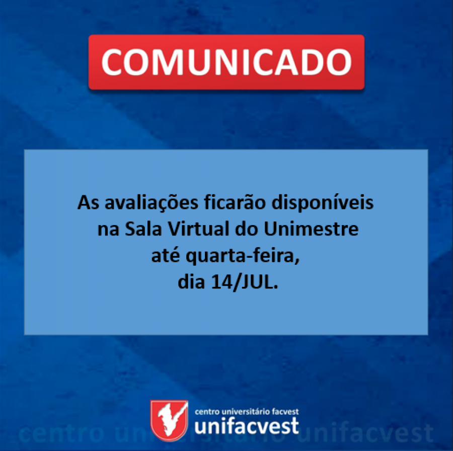 Comunicamos aos acadêmicos dos cursos presenciais que as avaliações ficarão disponíveis na Sala Virtual do Unimestre até quarta-feira, dia 14/JUL.