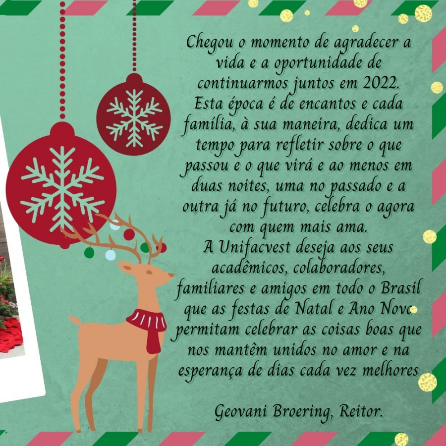 A Unifacvest deseja aos seus acadêmicos, colaboradores, familiares e amigos em todo o Brasil que as festas de Natal e Ano Novo permitam celebrar as coisas boas que nos mantêm unidos no amor e na esperança de dias cada vez melhores.