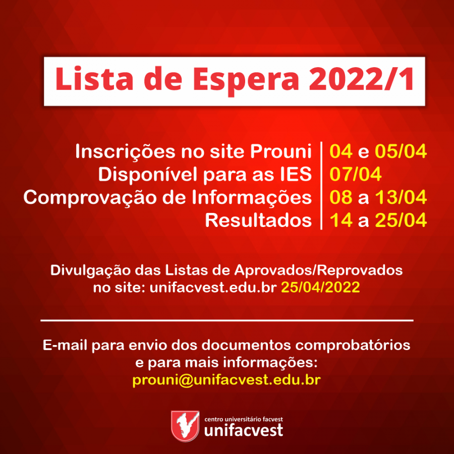 E-mail para envio dos documentos comprobatórios e para mais informações: prouni@unifacvest.edu.br