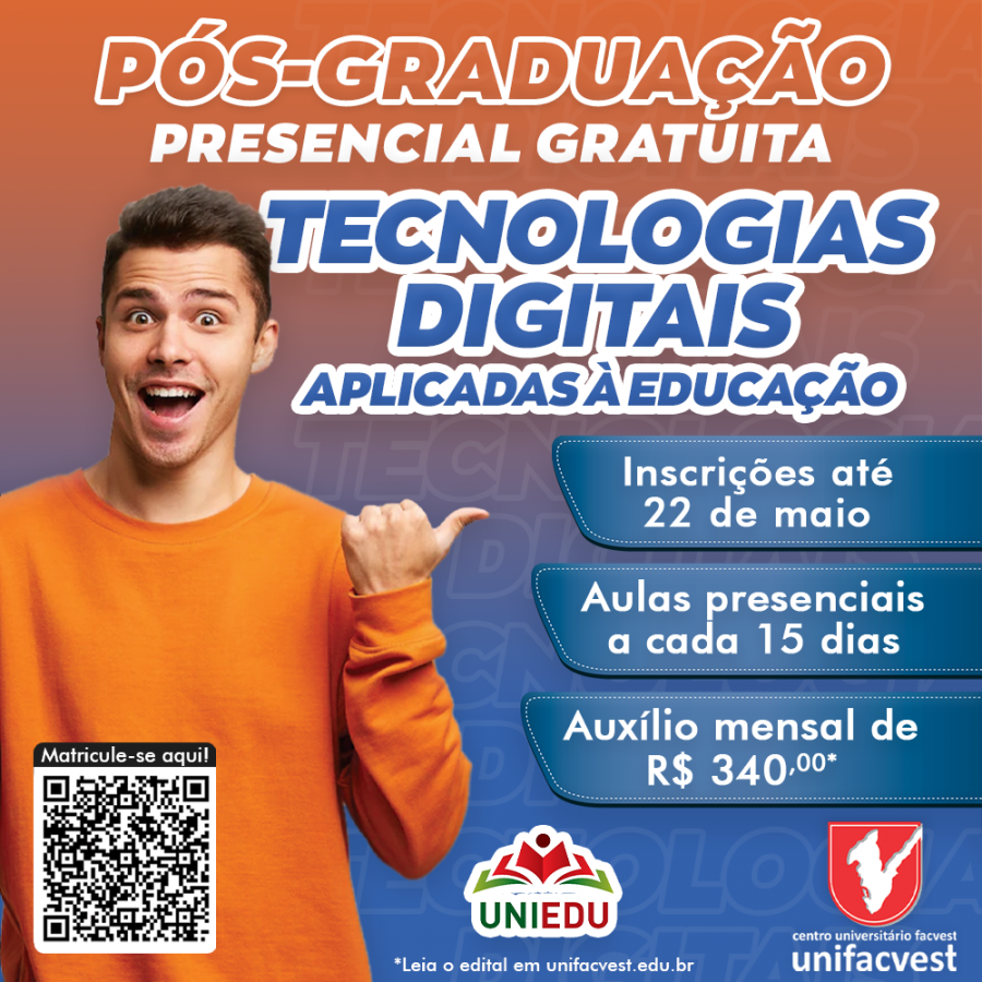 Na Unifacvest você pode fazer pós-graduação presencial de graça em Tecnologias Digitais Aplicadas à Educação e ainda receber R$340,00 mensais pelo Uniedu. Disponível nas cidades de Blumenau, Braço do Norte, Criciúma, Itajaí, Laguna, Mafra, São Bento do Sul e Timbó. Acesse https://unifacvest.edu.br para realizar sua matrícula ou nos chame pelo WhatsApp (49) 3225-4114.