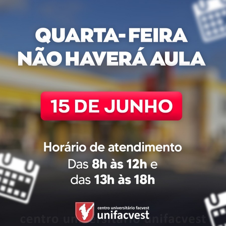 Atenção. Comunicamos que quarta-feira não haverá aula! Horário de atendimento na instituição será das 8h às 12h e das 13h às 18h.