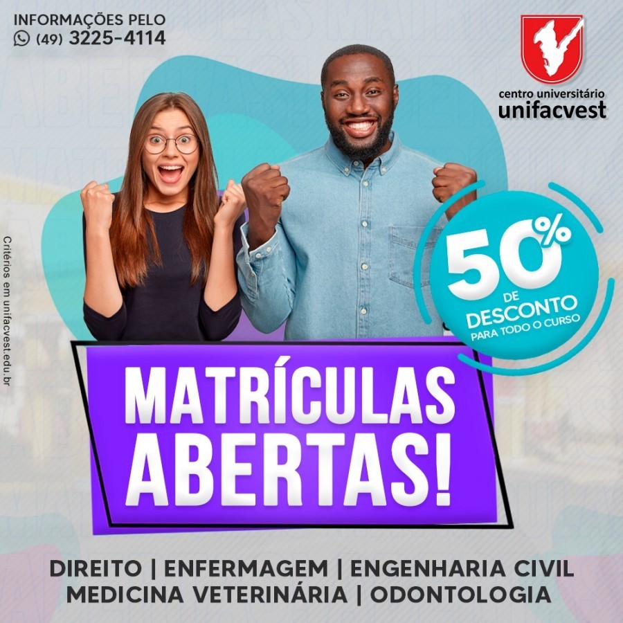 Faça agora mesmo sua matrícula e garanta 50% de desconto nas mensalidades para todo o curso!