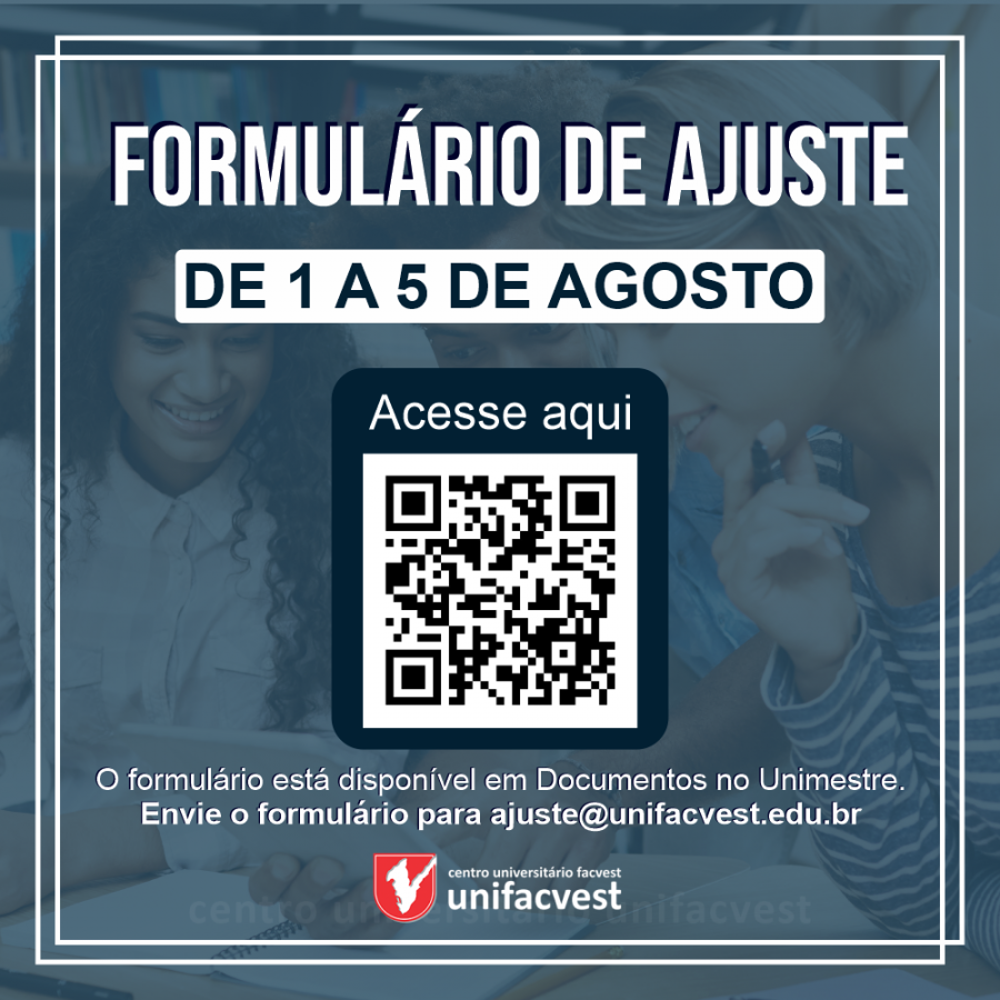 Formulário de Ajuste | De 1 a 5 de agosto O formulário está disponível em Documentos no Unimestre. Envie o formulário para ajuste@unifacvest.edu.br #VemPraUnifacvest #VemPraMelhor