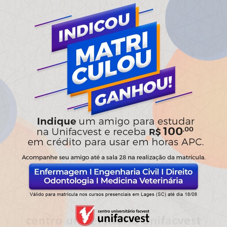 Indique um amigo para estudar na Unifacvest e receba R$100,00 em crédito para usar em horas APC.