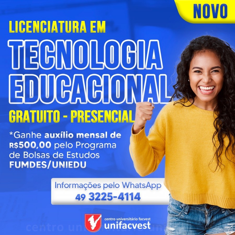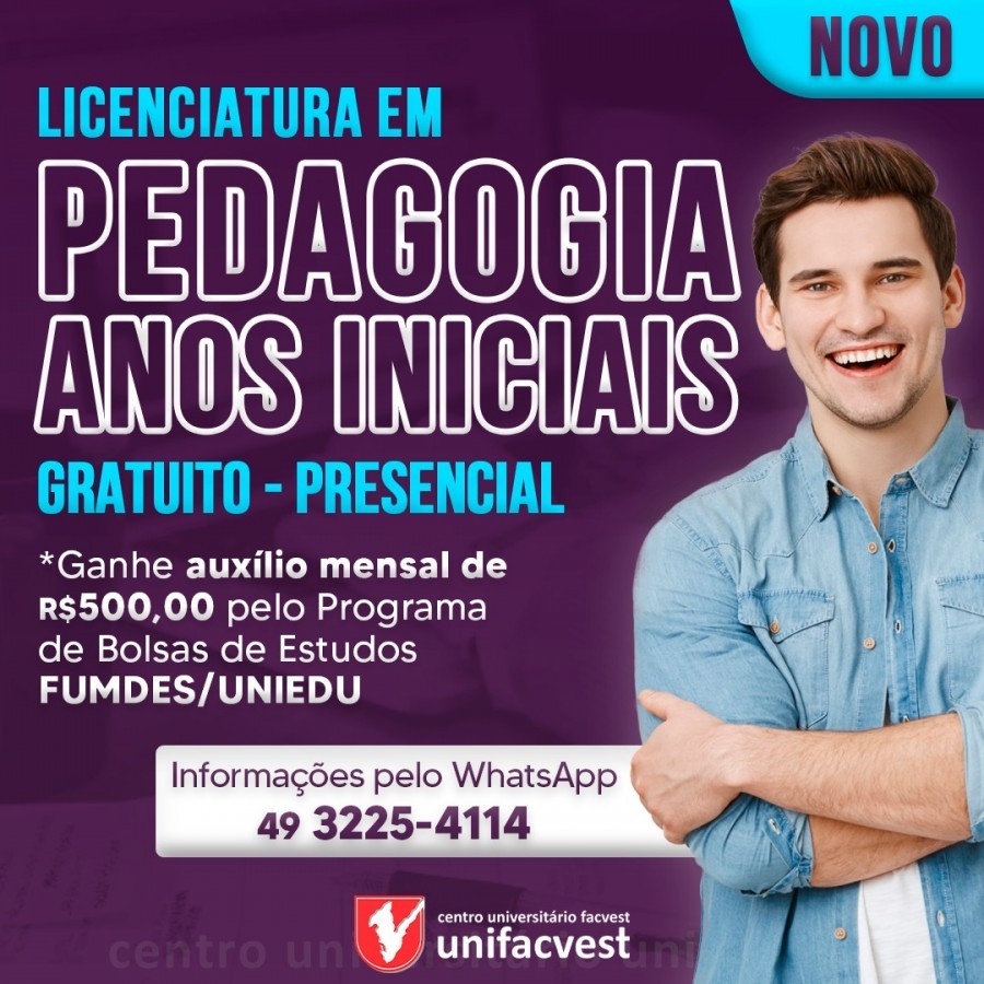 A Unifacvest está oferecendo cursos novos, presenciais e gratuitos em Pedagogia - Anos Iniciais e Tecnologia Educacional. Os acadêmicos receberão um auxílio de R$500,00 por mês, durante toda a graduação vinculado ao Uniedu, para auxiliar em gastos com transporte, lanche, materiais educacionais, entre outros.