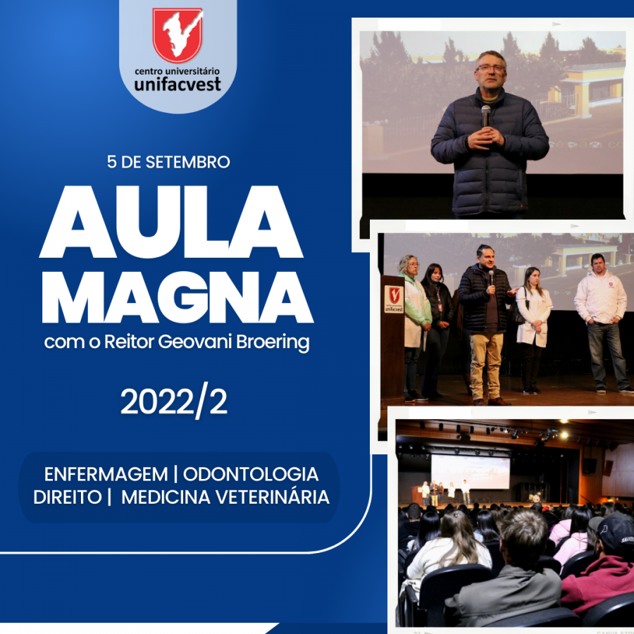 Os calouros dos cursos de Direito, Enfermagem, Medicina Veterinária e Odontologia, participaram de Aula Magna no dia 5 de setembro. No Teatro da Instituição, os acadêmicos foram recebidos pelo Reitor da Unifacvest, Professor Geovani Broering, acompanhado da Pró-reitora de Administração e Finanças Soraya Broering e do Pró-reitor Acadêmico Ricardo Leone Martins. Na oportunidade, os coordenadores dos cursos realizaram uma apresentação e desejaram boas-vindas aos novos acadêmicos.