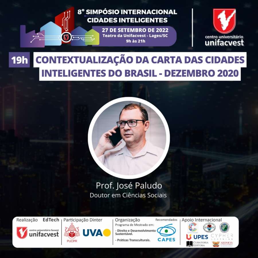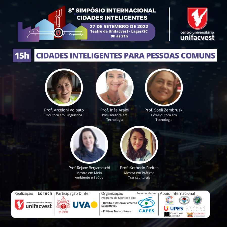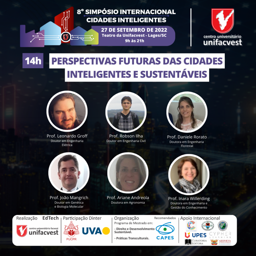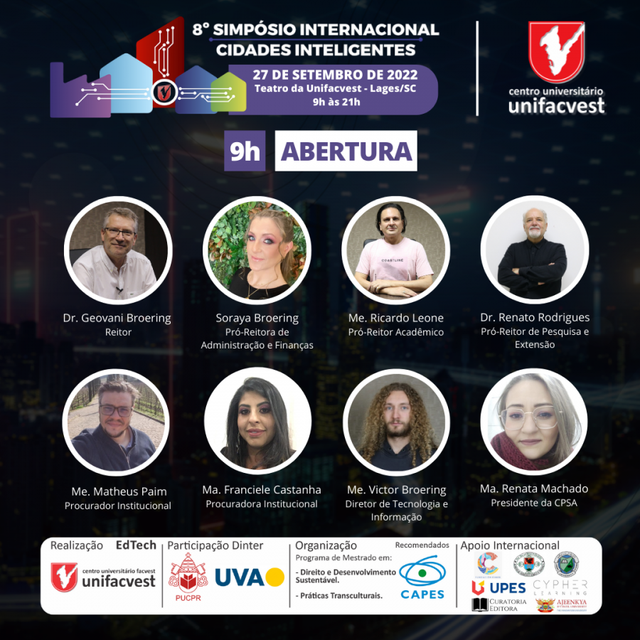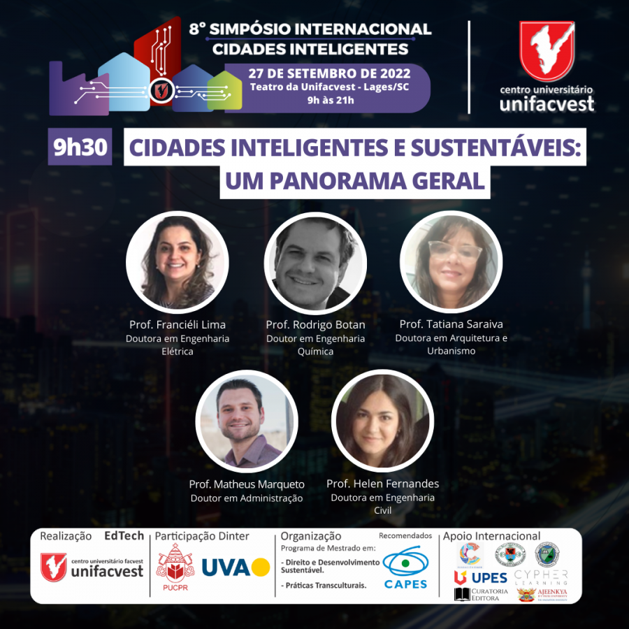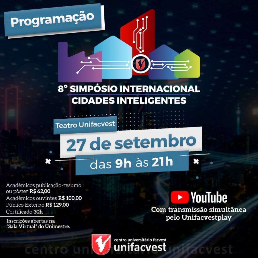 O 8º Simpósio Internacional da Unifacvest, com a temática, Cidades Inteligentes, acontece no dia 27 de setembro, das 9h às 21h, no Teatro da Instituição de forma presencial e com transmissão ao vivo pelo canal UnifacvestPlay do YouTube.