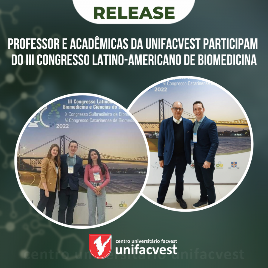 O professor e coordenador do curso de Biomedicina da Unifacvest, Dr. Jader Ruchel, esteve presente no evento representando a Instituição juntamente com as acadêmicas da 5ª fase do curso, Emanuelle Alves, Mariah Morgante e Raíssa Brandão. Professor Jader comentou sobre o conhecimento que acadêmicos adquirem através da participação em eventos extracurriculares, "A participação dos acadêmicos, seja em Semanas Acadêmicas em nossa Instituição, ou em Congressos como o que ocorreu em Florianópolis, são de extrema importância. Eles contribuem para o aprendizado, aprimoramento do conhecimento, compreensão de novas técnicas e metodologias científicas que estão sendo utilizadas na área e proporciona a troca de experiências entre os profissionais e os acadêmicos", concluiu.