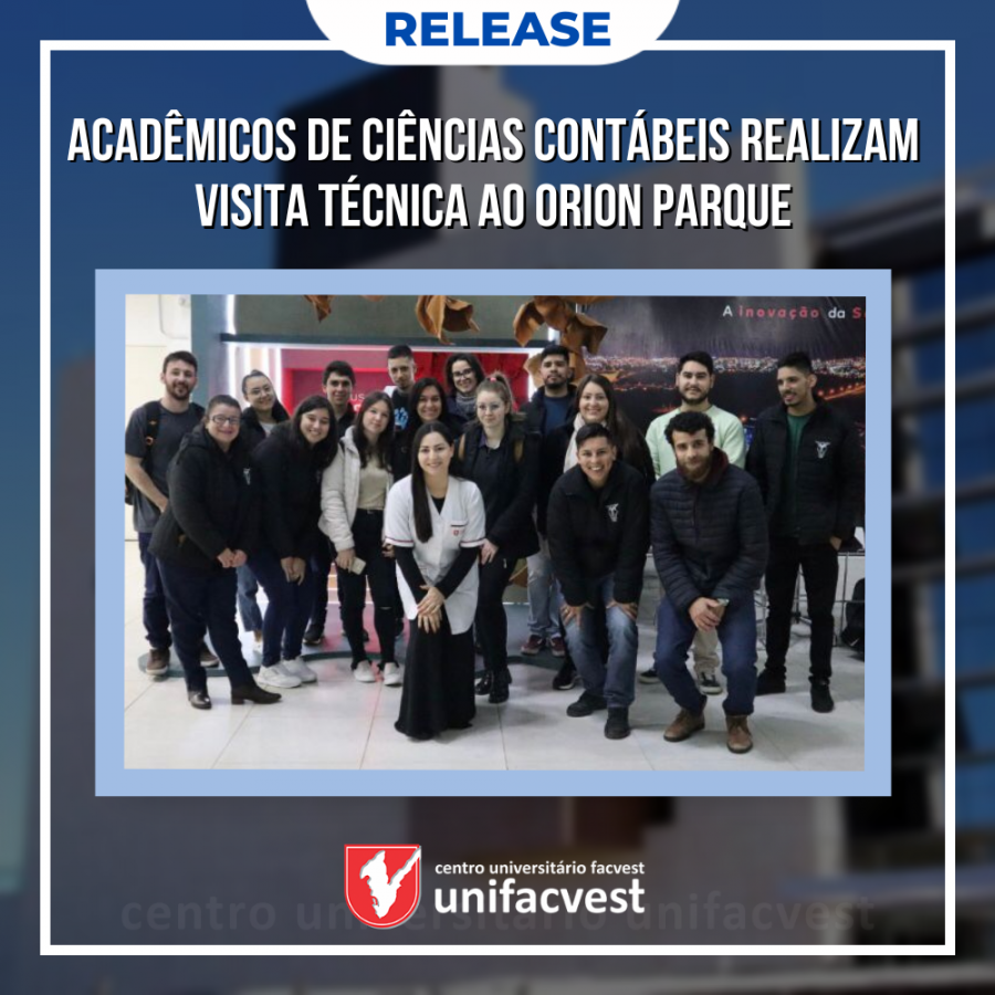 Acadêmicos da 6ª fase do curso de Ciências Contábeis da Unifacvest, realizaram uma visita técnica ao Orion Parque Tecnológico, em Lages/SC. O foco da visita foi "Contabilidade do Terceiro Setor e Empreendedorismo", tema esse, que está sendo estudado pelos acadêmicos em sala de aula com a professora e coordenadora do curso Amanda Miranda.