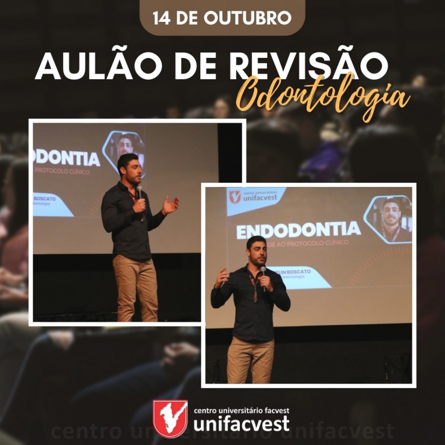 Na noite de 14 de outubro, o professor do curso de Odontologia da Unifacvest, Ricardo Boscato, o qual ministra a disciplina de Endodontia, realizou um aulão de revisão aos acadêmicos do curso, no Teatro da Instituição. O evento foi realizado com foco em esclarecer as dúvidas dos acadêmicos sobre os conteúdos da disciplina.