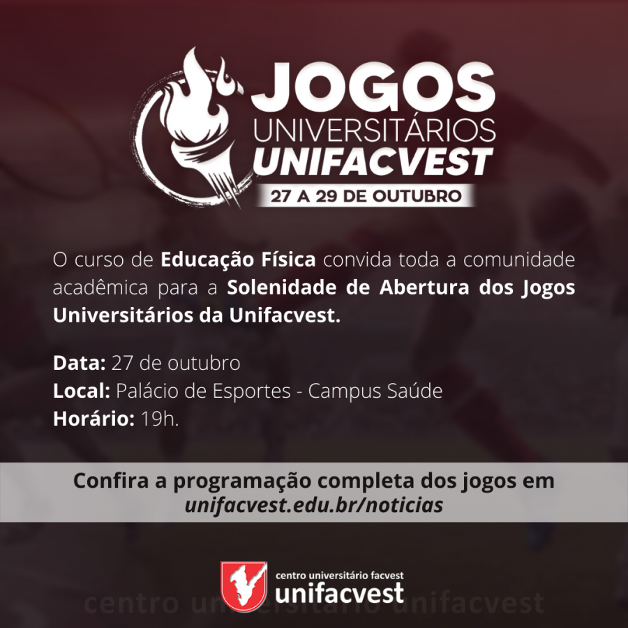 O curso de Educação Física convida toda a comunidade acadêmica para a Solenidade de Abertura dos Jogos Universitários da Unifacvest.