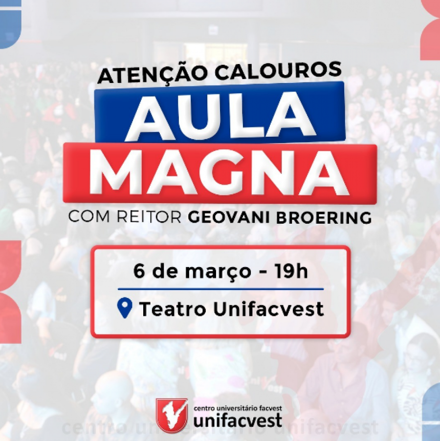 Segunda-feira, dia 6 de março, o Reitor da Unifacvest, Prof. Dr. Geovani Broering, receberá todos vocês às 19h no Teatro para a Aula Magna. Sugerimos que estejam na universidade a partir das 18h30.