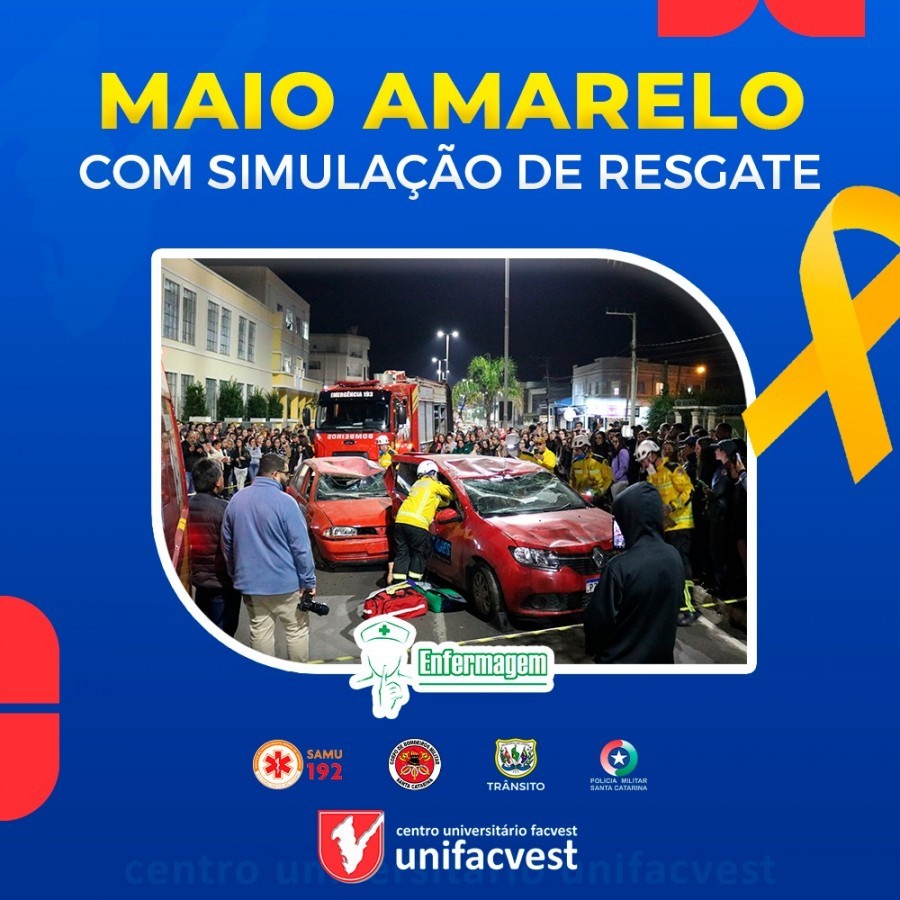 O movimento Maio Amarelo procura alertar a sociedade para o alto índice de mortos e feridos no trânsito. A Unifacvest realizou na segunda-feira, dia 15 de maio, uma ação de simulação de resgate de trânsito que contou com a participação dos profissionais do SAMU, do corpo de Bombeiros Militar, dos Agentes de Trânsito da Prefeitura de Lages, da Polícia Militar e com os acadêmicos e docentes do Curso de Enfermagem.