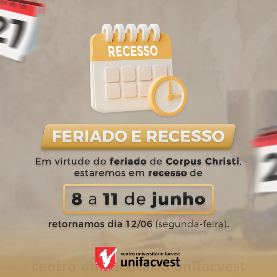 O Centro Universitário Unifacvest informa que estará em recesso de 8 (Corpus Christi) a 11 de junho.