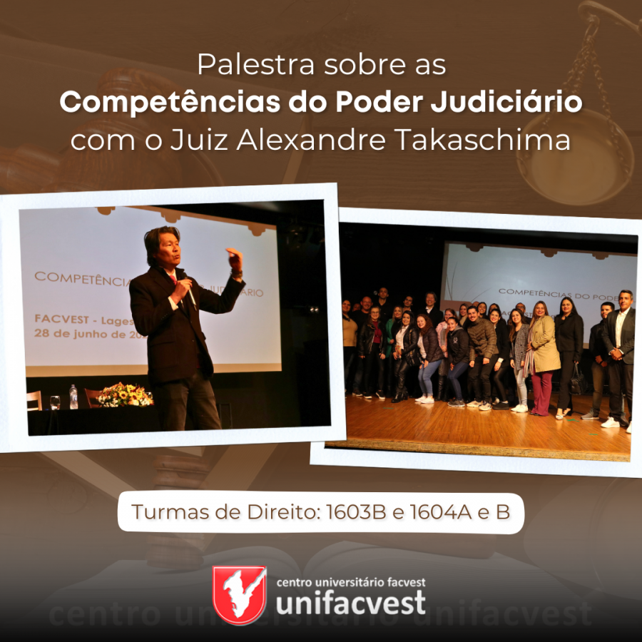 A palestra do Juiz Alexandre Takaschima confirma que a Unifacvest integra os seus acadêmicos ao cenário profissional. Atividades como esta, infraestrutura moderna e os melhores professores garantem a oferta do melhor Curso de Direito de Lages na avaliação do MEC.