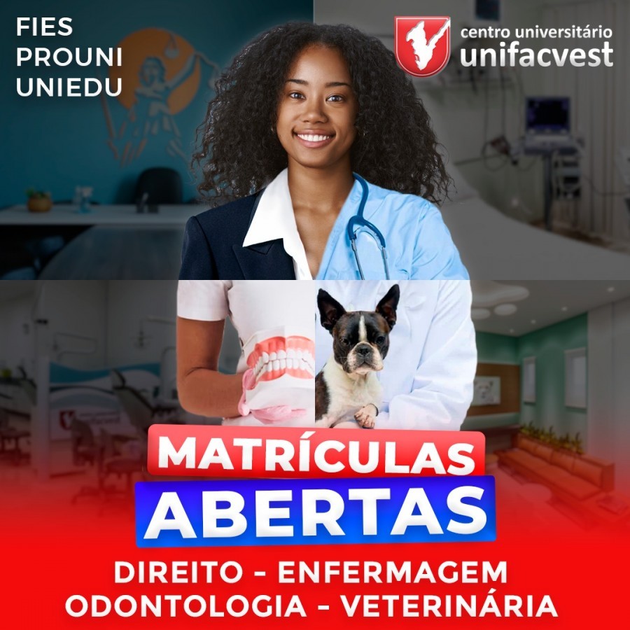 A Unifacvest está com matrículas abertas para os cursos presenciais de Direito, Enfermagem, Odontologia e Veterinária para o semestre 2023/2.