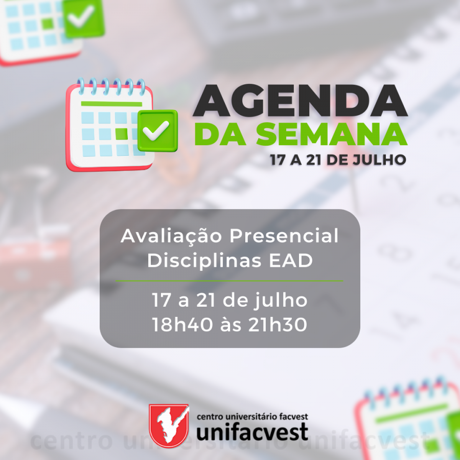 Até sexta-feira (21/7) acontece a Avaliação Presencial das disciplinas EAD das 18h40 às 21h30.