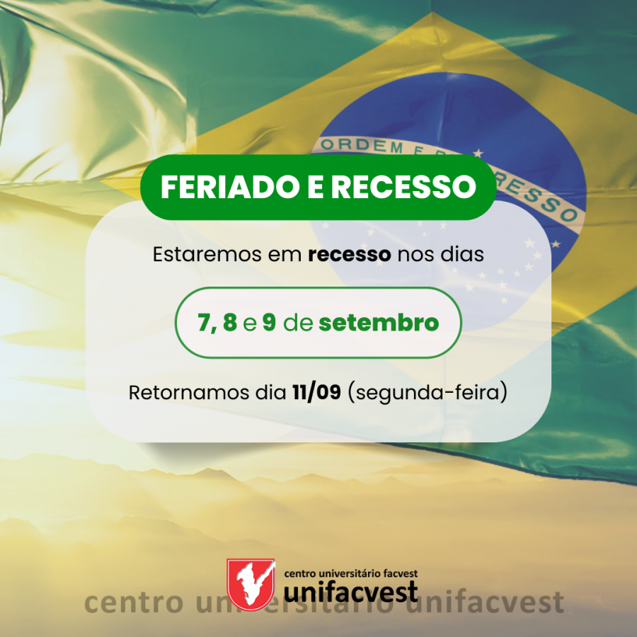 Feriado e Recesso da Independência Estaremos em recesso nos dias 7, 8 e 9 de setembro. Retornaremos às atividades na segunda-feira, dia 11.