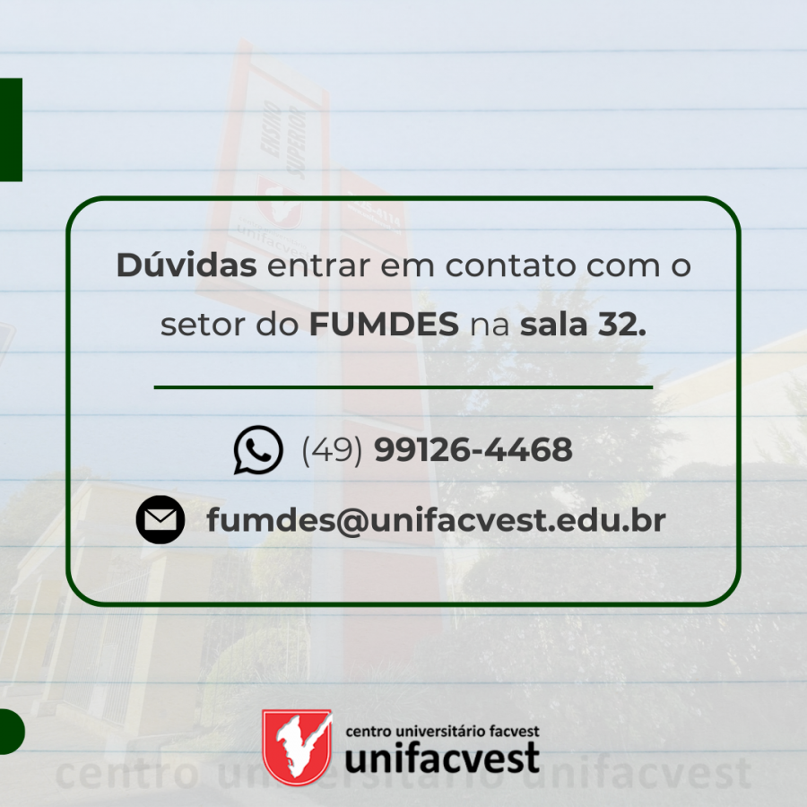 Dúvidas entrar em contato com o setor do FUMDES (49) 99126-4468 ou presencialmente na sala 32.