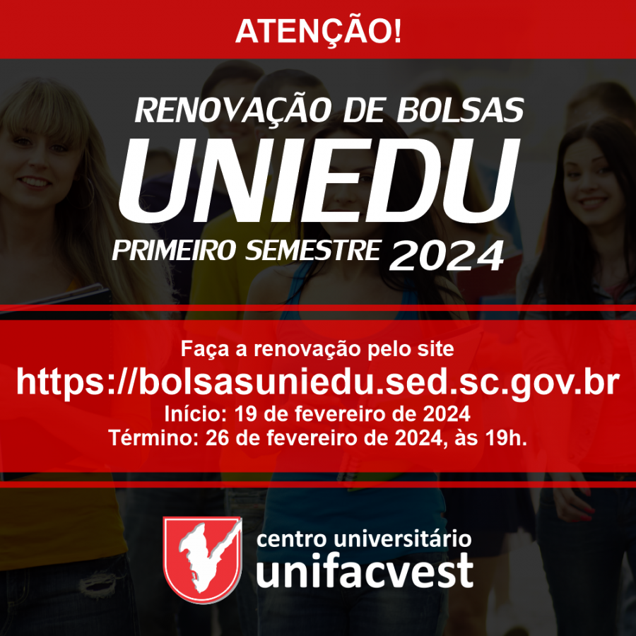 Renovação das Bolsas até às 19h do dia 26/fev/2024 em https://bolsasuniedu.sed.sc.gov.br