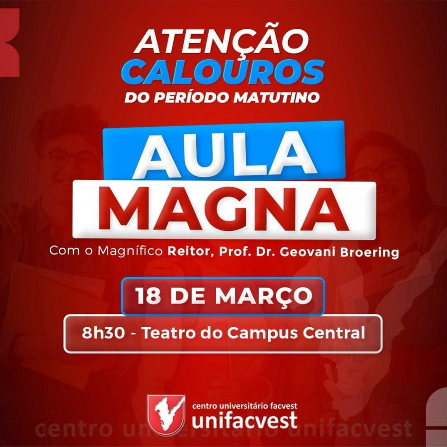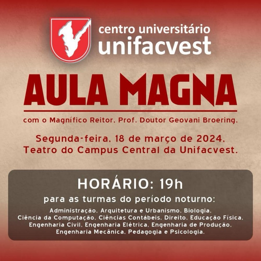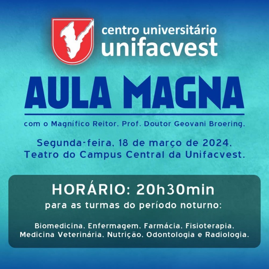 No Teatro do Campus Central da Unifacvest, o Magnífico Reitor, Prof. Dr. Geovani Broering, ministrará a Aula Magna de Boas-vindas e início da Jornada de Atividades Acadêmicas aos calouros de 2024/1. Confira nas imagens abaixo o horário da Aula Magna do seu Curso.