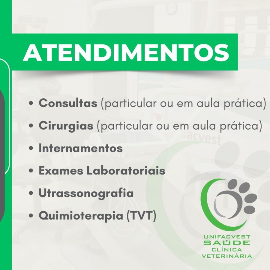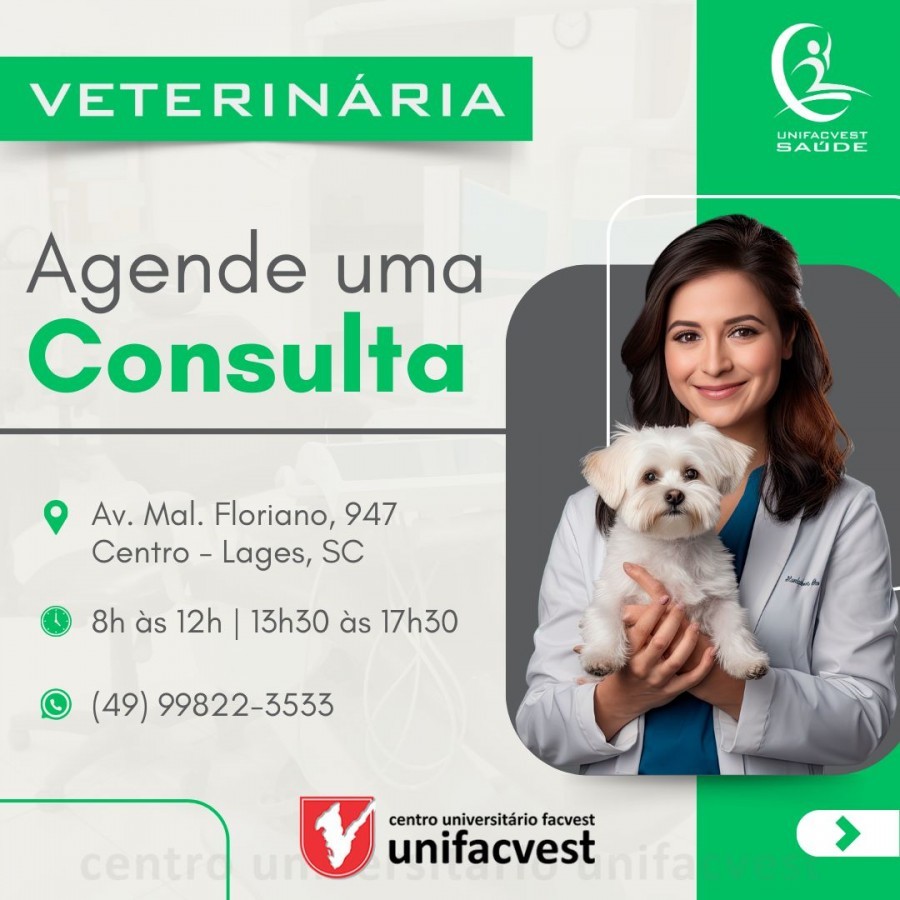 A Clínica Escola de Veterinária do Unifacvest Saúde Animal está esperando o seu pet com os melhores profissionais. Os nossos professores, mestres e doutores, orientam as práticas clínicas integradas aos estágios curriculares supervisionados.