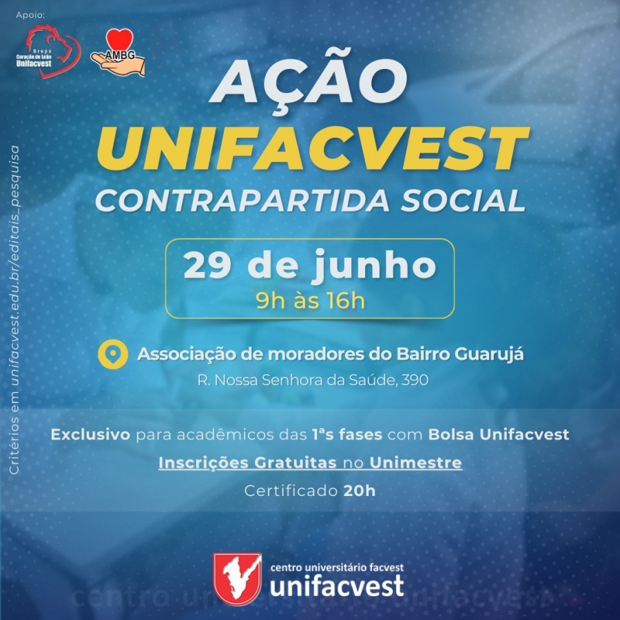 A Unifacvest com o apoio do Grupo Coração de Leão e da Associação de Moradores do Bairro Guarujá - AMBG realizará a Ação Unifacvest - Contrapartida Social no sábado, dia 29 de junho, das 9h às 16h, no Bairro Guarujá. O ponto de encontro será na sede da AMBG, na Rua Nossa Senhora da Saúde, Nº 390.