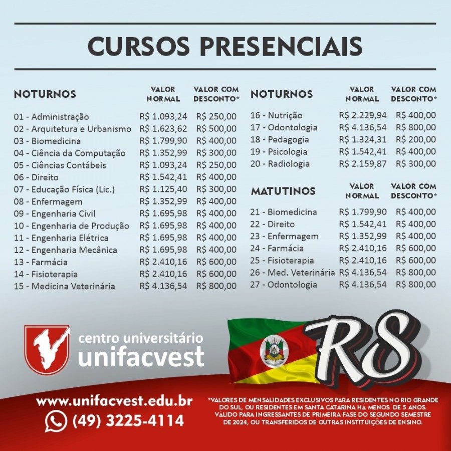 A Unifacvest está oferecendo uma condição especial com descontos que chegam a 80% para matrículas em todos os Cursos Presenciais em Lages (SC).