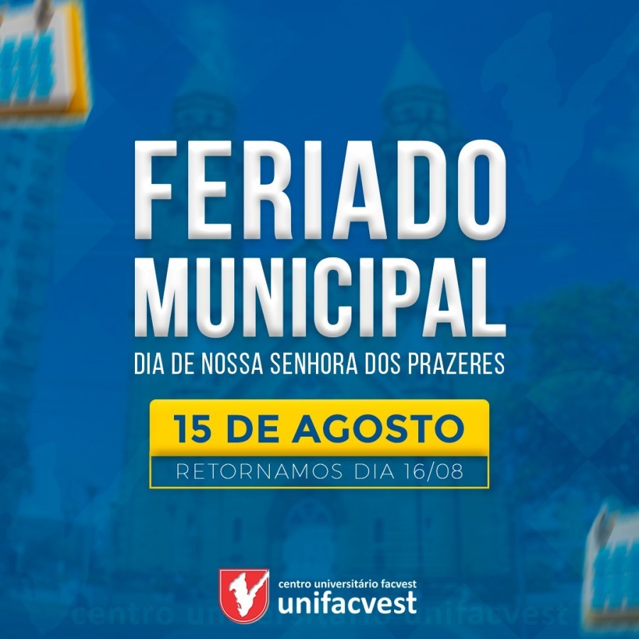 No dia 15 de agosto é Feriado Municipal em Lages (SC). Somente nesta data não haverá atividades acadêmicas no Campus Central. Haverá plantão telefônico para informações sobre a Bolsa FUMDES. Sexta e sábado a Unifacvest terá atividades e aulas normalmente.