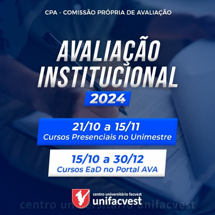 A avaliação acontecerá de 21/10/2024 a 15/11/2024 no portal do UNIMESTRE para os Cursos Presenciais. Até o dia 08/11/2024 as turmas, juntamente com os docentes, farão a autoavaliação nos laboratórios da Unifacvest. Após esse período apenas no Unimestre.