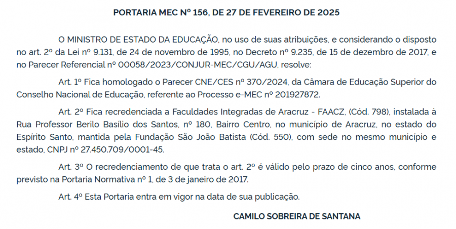 MEC publica Portaria de Recredenciamento da Unifacvest