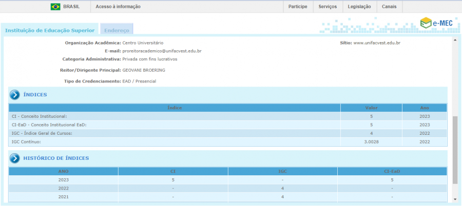 Consulte aqui o cadastro da Unifacvest no e-MEC.