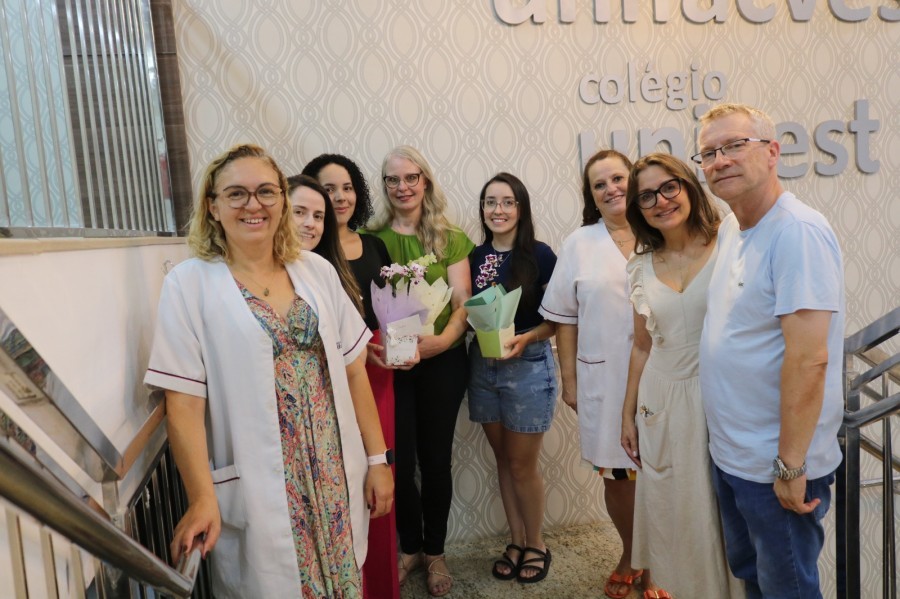 Acadêmicas, coordenadora e a professora Magali Tagliari Graf receberam da Reitoria os cumprimentos pelo trabalho de resultado que empreendem e pelo destaque na carreira profissional. “Nosso objetivo é oferecer uma formação de excelência para a comunidade acadêmica”, afirma o Reitor Geovani Broering e “as flores representam a nossa gratidão pela responsabilidade assumida em servir aos enfermos com qualidade”, expressou Soraya Lemos Erpen Broering, Vice-Reitora.