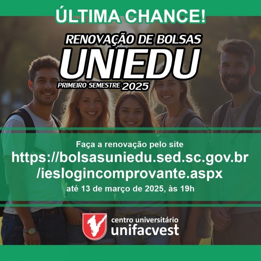 Não perca a última chance da renovação da Bolsa UNIEDU. O cadastro encerra às 19h de quinta-feira, dia 13 de março. Toda a documentação deve ser inserida diretamente no site do do programa. O link está na nossa bio e todas as orientações foram enviadas aos bolsistas por e-mail e WhatsApp.