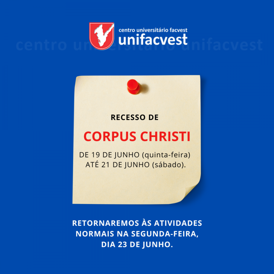 O Centro Universitário Unifacvest estará em Recesso de quinta-feira, dia 19 de junho até sábado, dia 21 de junho.