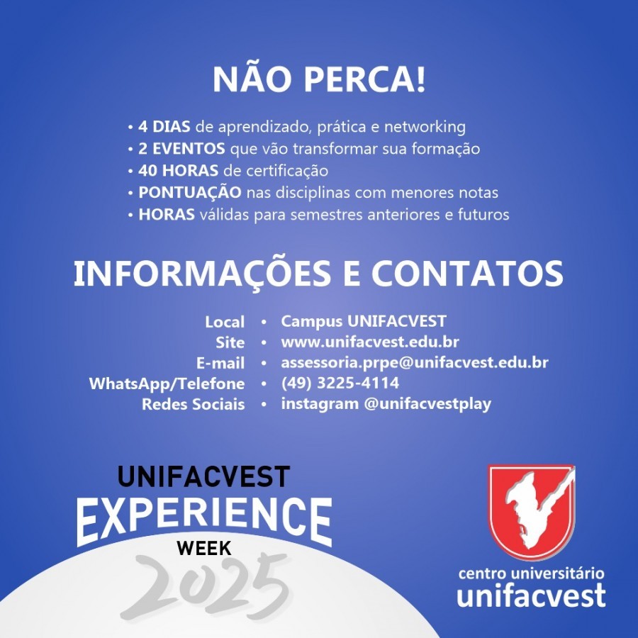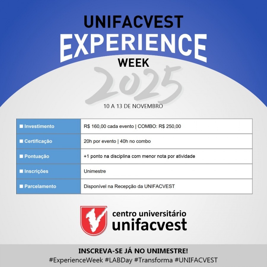 Unifacvest Experience Week 2025 - de 10 a 13 de novembro de 2025 no Campus Central da Universidade.