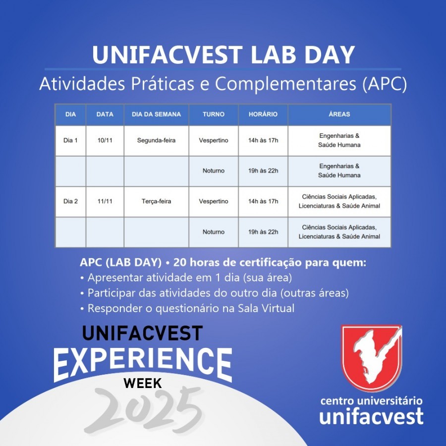 Unifacvest LAB Day (APC) dias 10 e 11/11/2025 - 20h (+ 1 ponto em 1 disciplina que tiver a menor média)