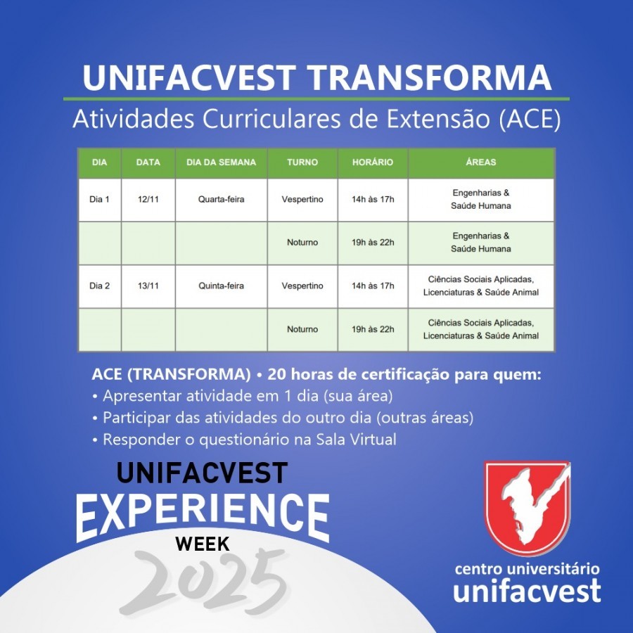 Unifacvest Transforma (ACE) dias 12 e 13/11/2025 (+ 1 ponto em 1 disciplina que tiver a menor média)