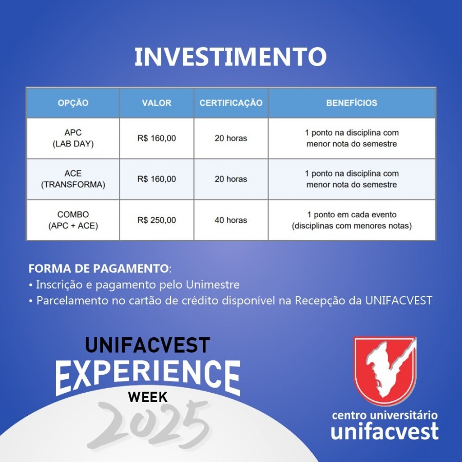 Investimento: R$ 160,00 por atividade ou R$ 250,00 no combo com as duas atividades. No combo o acadêmico terá 1 ponto na média em 1 disciplina referente à atividade 1 e outro ponto na média em outra disciplina referente à atividade 2. Parcelamento no cartão de crédito na recepção da Unifacvest em até 3 vezes.