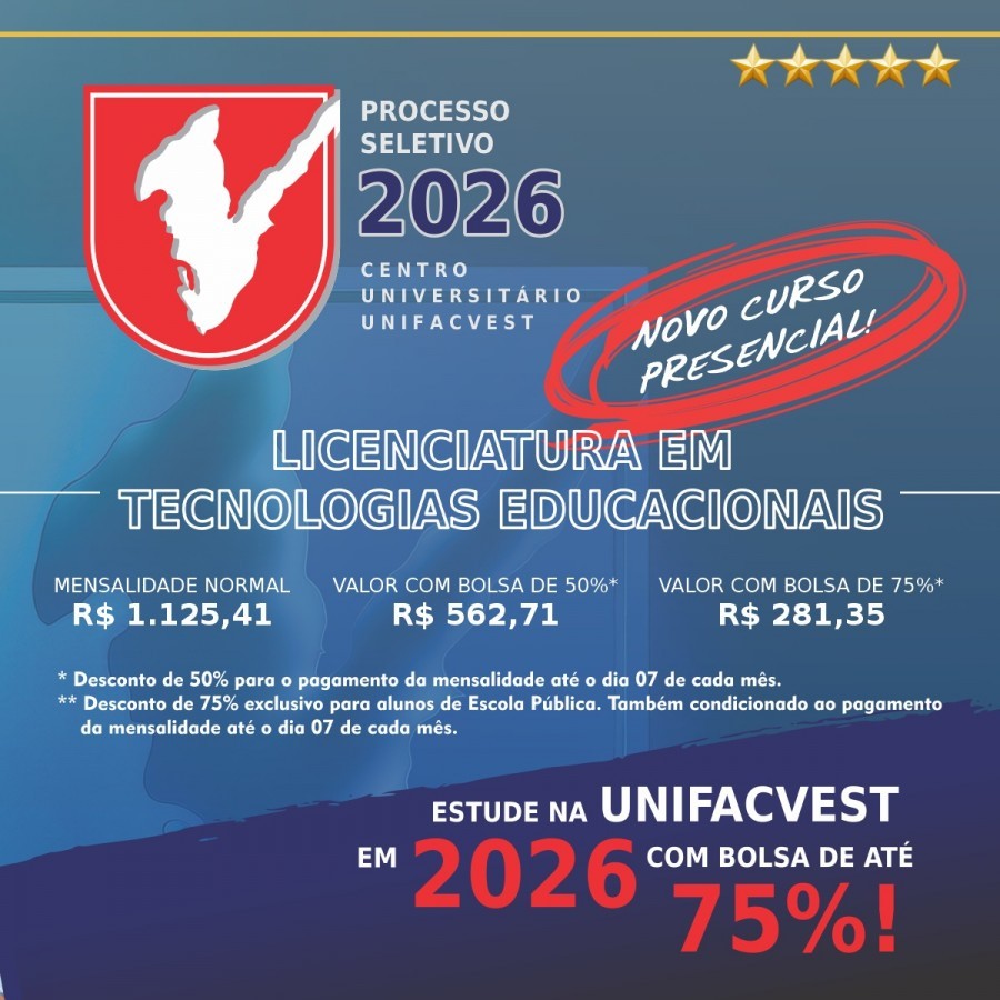 A Unifacvest está com matrículas abertas para os cursos de Licenciatura em Tecnologias Educacionais e Ciências Biológicas, ambos no período noturno, com início em 23 de março de 2026. Localizada em Lages (SC), a instituição oferece a melhor infraestrutura para formação de professores: a melhor biblioteca de Santa Catarina na avaliação do MEC, laboratórios com tecnologia de ponta, clínicas-escola para práticas e estágios, além de uma Sala Virtual dinâmica com realidade virtual, realidade aumentada, gamificação e acesso às principais bibliotecas digitais. Oferecemos 50% de desconto por pontualidade (pagamento até o dia 7) e 75% de desconto durante todo o curso para alunos que concluíram o ensino médio em escola pública ou com bolsa integral. O currículo segue o Decreto MEC Nº 12.456/2025, com até 30% da carga horária em EAD e 10% em atividades de extensão comunitária.