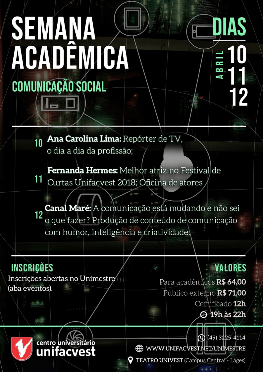 A Semana Acadêmica de Comunicação Social da Unifacvest acontece nos dias 10,11 e 12 de abril no Teatro Univest, no campus central em Lages (SC). Nas três noites, das 19h às 22h, a temática será "A comunicação na era digital".