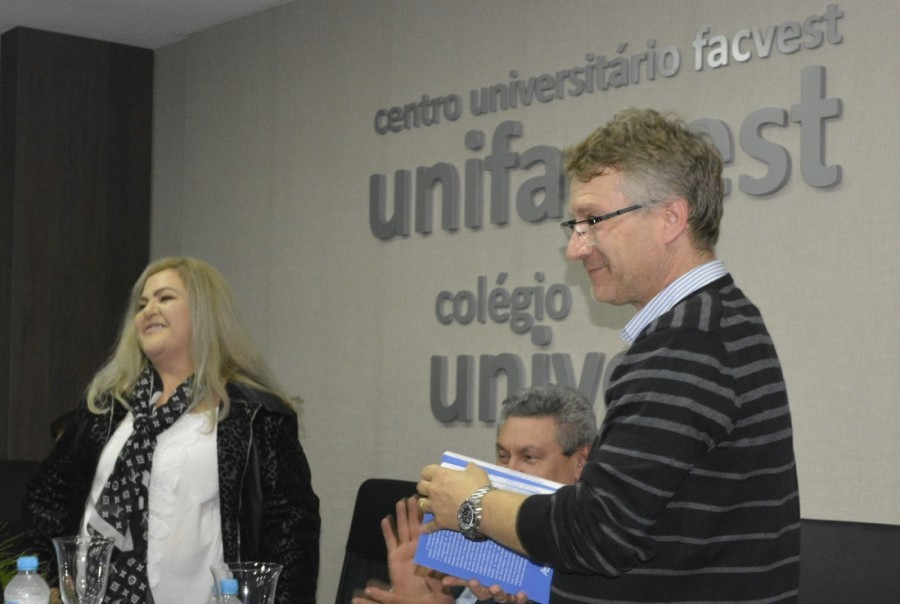 Após a fala, a autora fez a entrega simbólica de um exemplar ao reitor da Unifacvest, Giovani Broering, e autografou livros para os demais presentes.