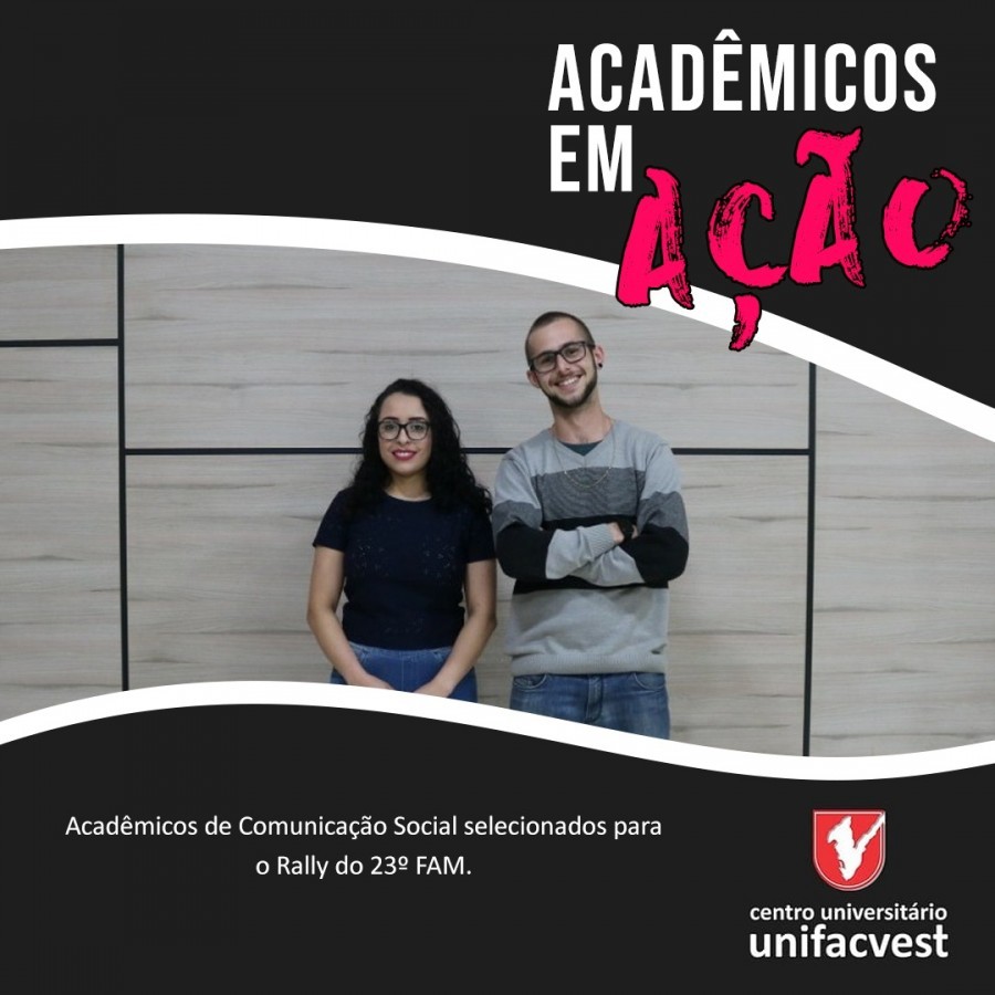Os acadêmicos Francisco Kirchner (Publicidade & Propaganda) e Jessie Marielle Ribeiro (Jornalismo) foram selecionados para participar do Rally Universitário do 23º Florianópolis Audiovisual Mercosul que acontece entre 26 de setembro e 02 de outubro na capital catarinense. Foram abertas 25 vagas para todo o Mercosul e o FAM contará com participantes de todos os países que integram o bloco. O acadêmico Francisco Kirchner integra a equipe da Unifacvest Press – Agência Experimental de Conteúdo e Comunicação Digital formada exclusivamente por bolsistas do PIBIC.