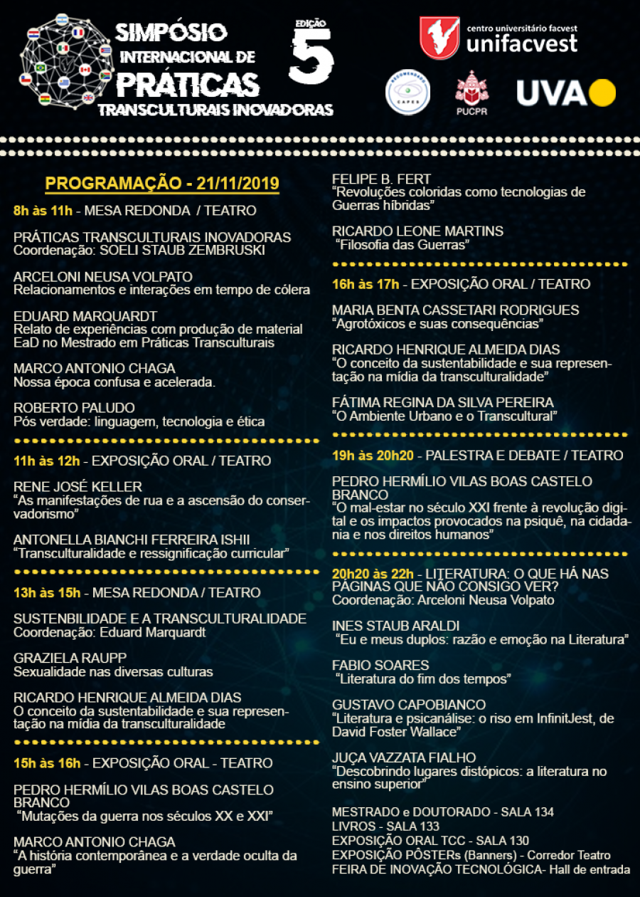 Confira a programação do V Simpósio Internacional de Práticas Transculturais Inovadoras que acontece no dia 21 de novembro de 2019 no Campus Central da Unifacvest em Lages (SC).