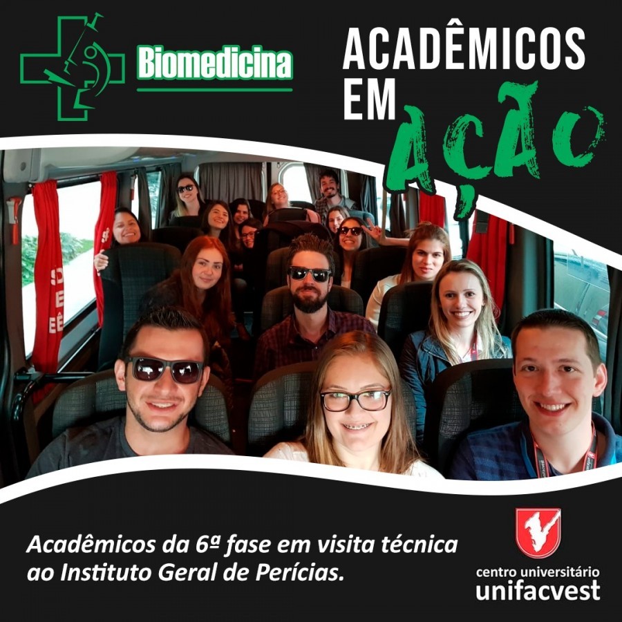 Os professores Camila Buzzi Colley, Jader Ruchel e Lucas Gonçalves Ferreira com o Perito Criminal Bioquímico Fernando Meurer e os acadêmicos da 6 fase de biomedicina em visita técnica ao Instituto Geral de Perícias.