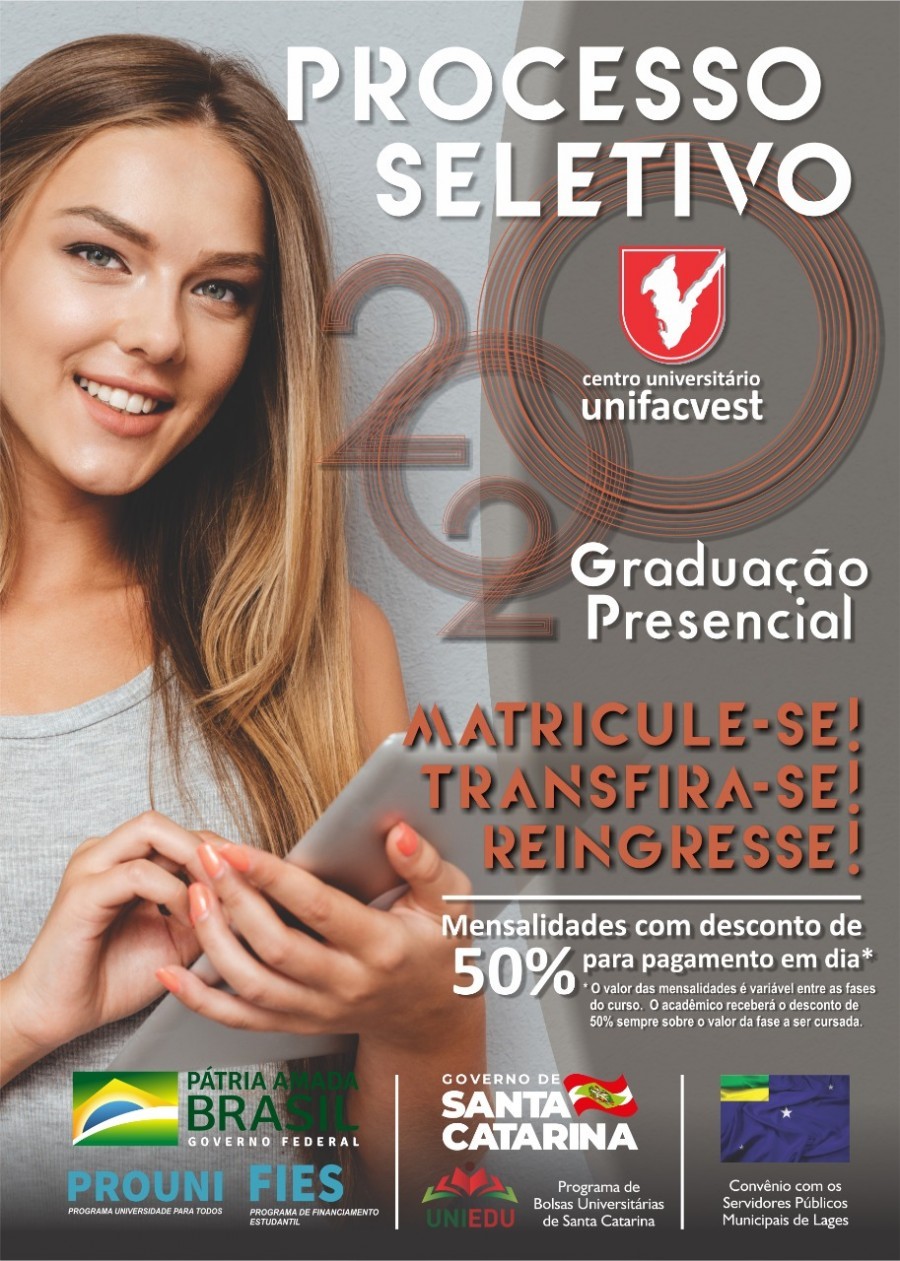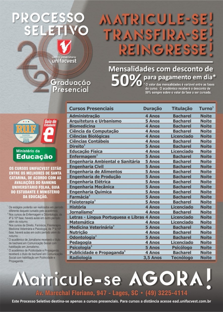 Estamos esperando você no Campus Central da Unifacvest em Lages com promoção de 50%* de desconto nas mensalidades durante todo o curso, para pagamento em dia, para as vagas remanescentes do vestibular de verão. São 29 opções de cursos em todas as áreas do conhecimento.
